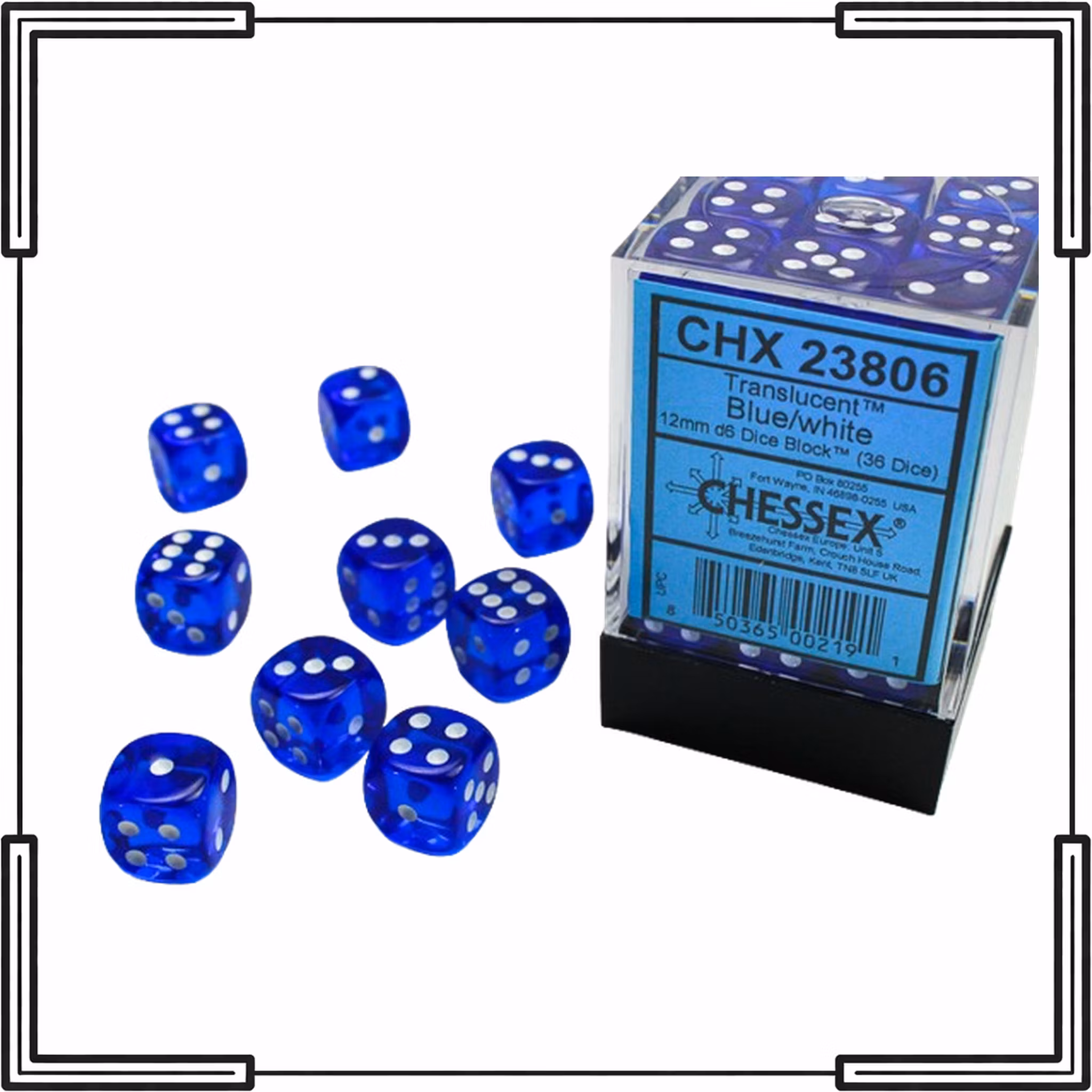 Chessex Translucent Blue/White är ett komplett tärningsblock med 36 stycken 12 mm D6-tärningar i klar transparent blå design med vit numrering.